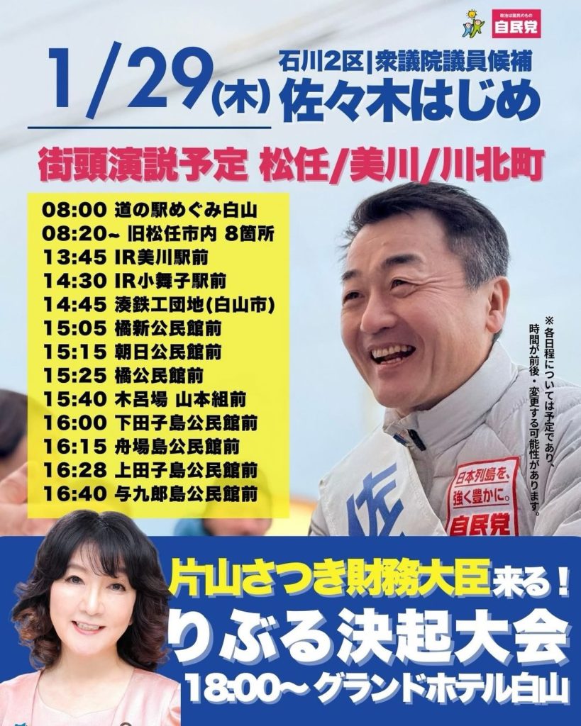【1/29 佐々木はじめスケジュール】 2026.01.29 トピックス 佐々木はじめ候補が、石川2区内各地で街頭演説を行います!1月29日は、松任/美川(白山市)・川北町をまわります!スケジュール画像はご自由にスクショorダウンロード&シェアOK!お近くの方にもぜひお知らせください!夜は、グランドホテル白山にて「りぶる決起大会」を行います。佐々木はじめ候補の応援に、片山さつき財務大臣が駆けつけてくださいます!応援・拡散のご協力、よろしくお願いします。 一覧に戻る