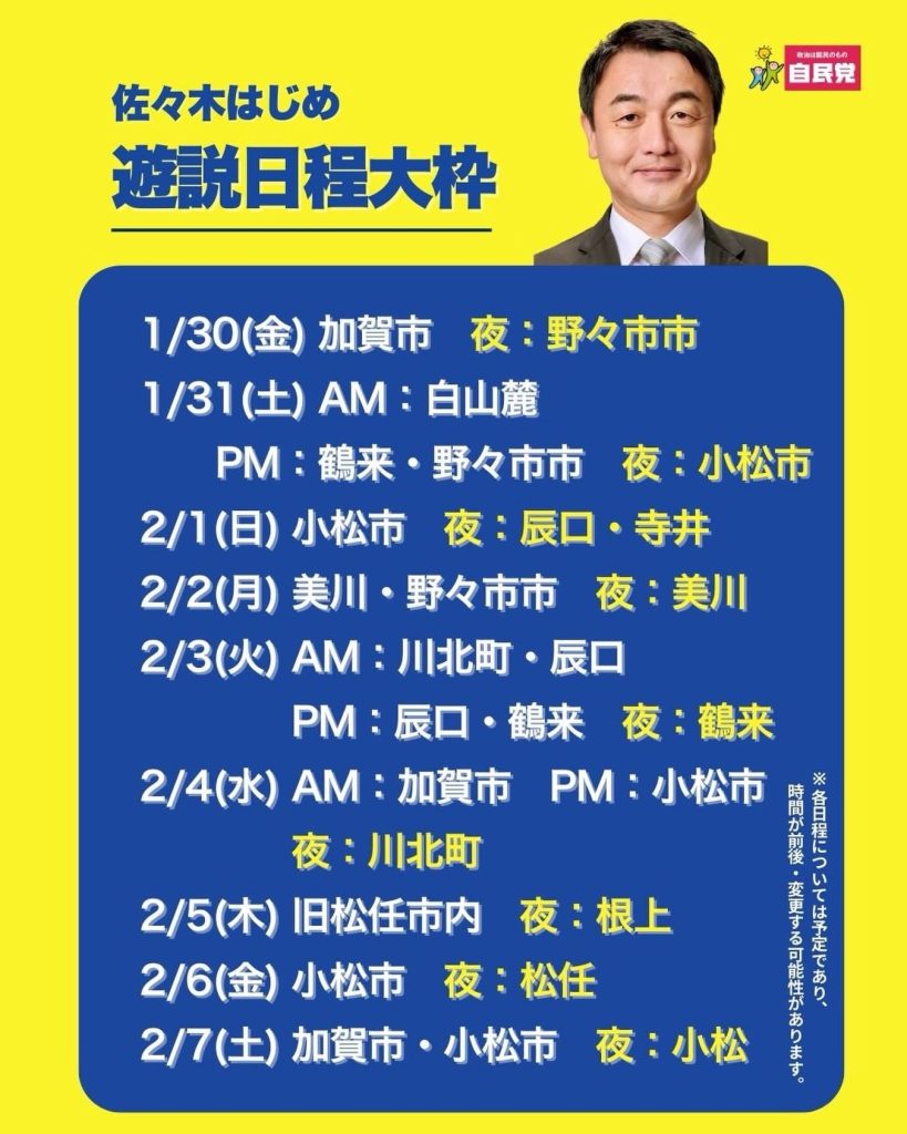 これまで、翌日の詳しい遊説日程をお知らせしてきましたが、石川2区は広く、