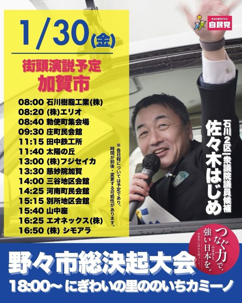 【1/30 佐々木はじめスケジュール】 2026.01.30 トピックス 佐々木はじめ候補が石川2区内各地で、街頭演説を行います!1月30日は、日中は加賀市内をまわり、夜は野々市市にて総決起大会を行います!スケジュール画像はご自由にスクショorダウンロード&シェアOK!お近くの方にもぜひお知らせください!応援・拡散のご協力、よろしくお願いします。 一覧に戻る