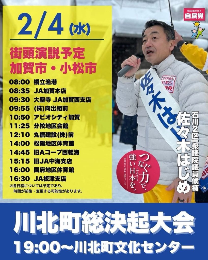 2月4日水曜日は、加賀市、小松市をまわります!