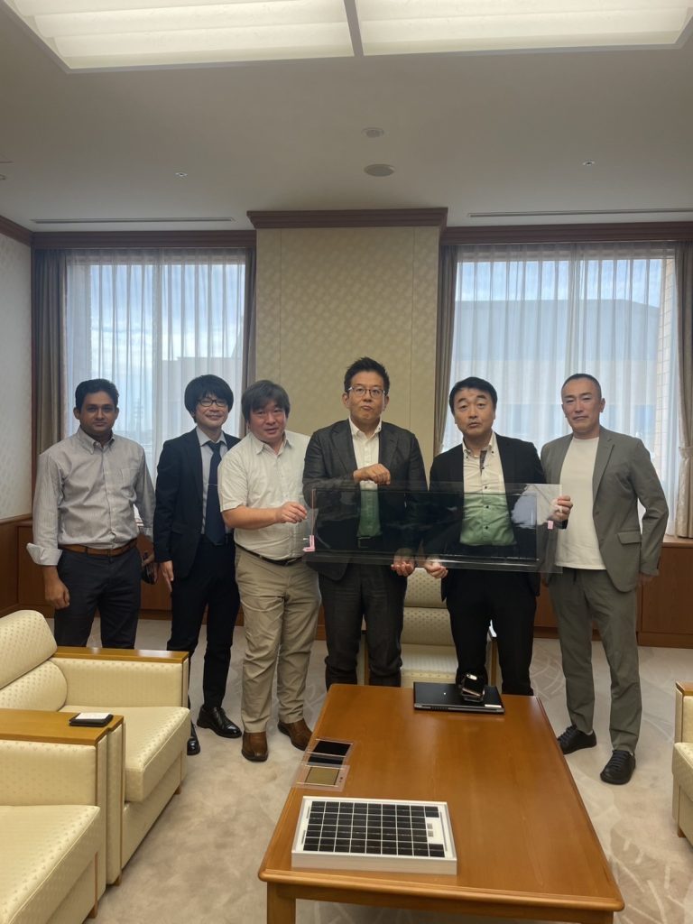 9月24日、国産の太陽光発電フィルムであるペロブスカイトの研究者である金沢大学の當摩(たいま)哲也教授を石川県の浅野副知事に紹介しました。
