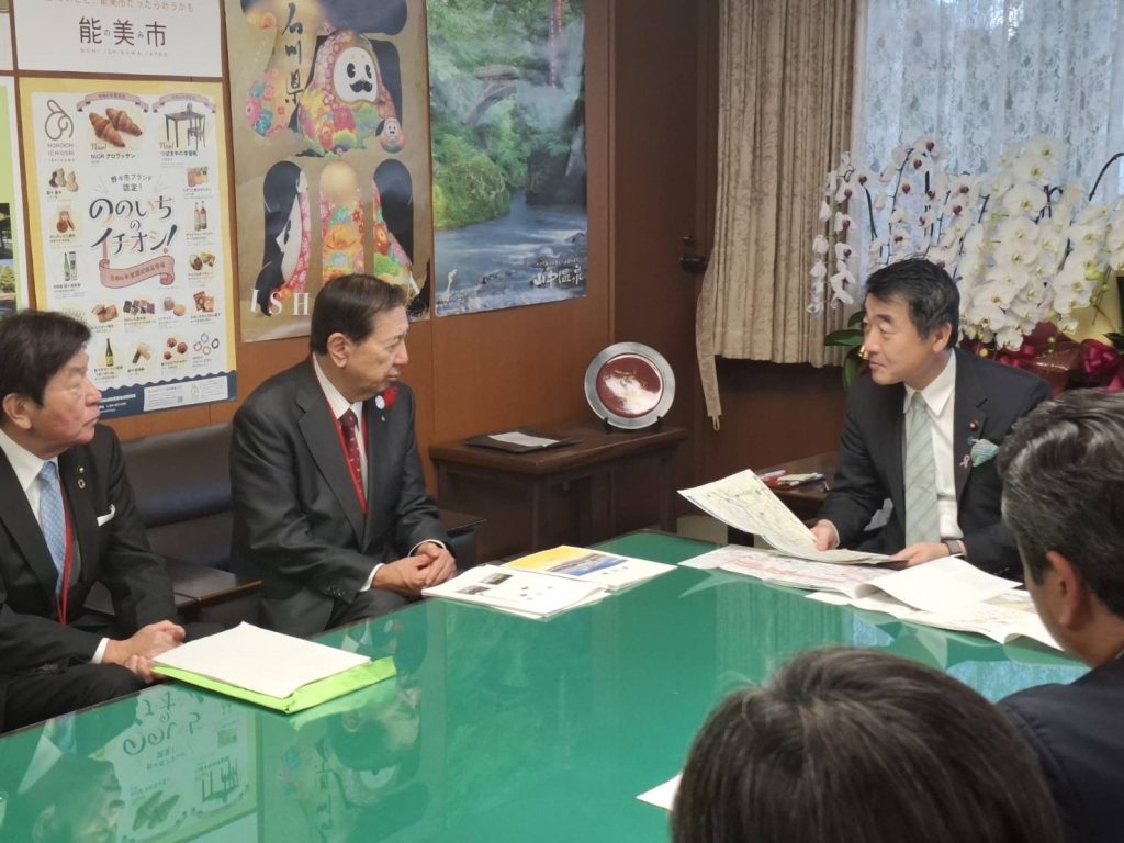 11月18日、「金沢福光連絡道路整備促進期成同盟会・東部環状道路建設促進協議会、八乙女連絡道路整備計画推進協議会」村山金沢市長、堂故会長、油野かほく市長、粟野々市市長、生田内灘町長より、「石川県津幡町・富山県小矢部市」矢田津幡町長、桜井小矢部市長より、橘代議士、西田代議士、宮本参議院議員、柴田参議院議員に同行いただき、要望をいただきました。
